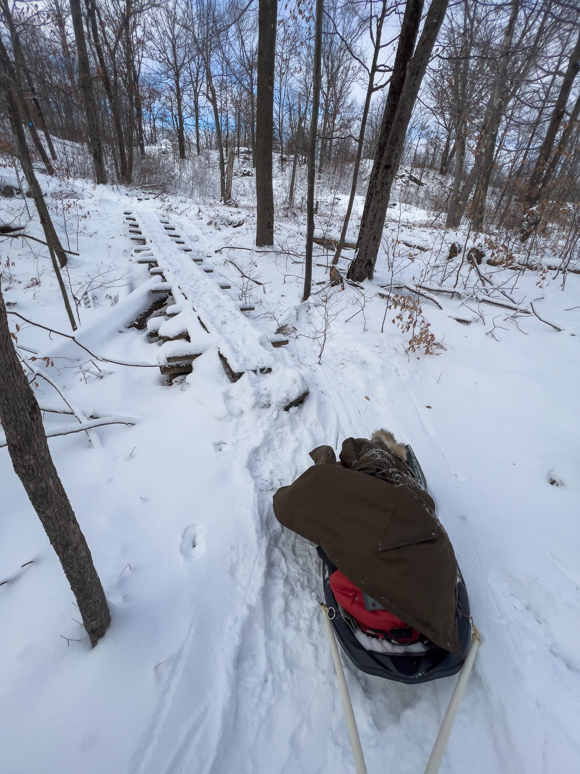 Appa and his human, Robyn, joined me on this grand experiment of becoming living popsicles. The scenery was breathtaking, but the steep rocky trails made it quite tiring, primarily because I towed a pulk. Pulks are fantastic for moving gear over snow, but their utility is a tad less efficient when meandering up and down steep, winding, narrow trails. I had to deal with countless ordeals of the pulk deciding to go rogue on the side of a cliff or when going over narrow bridges.