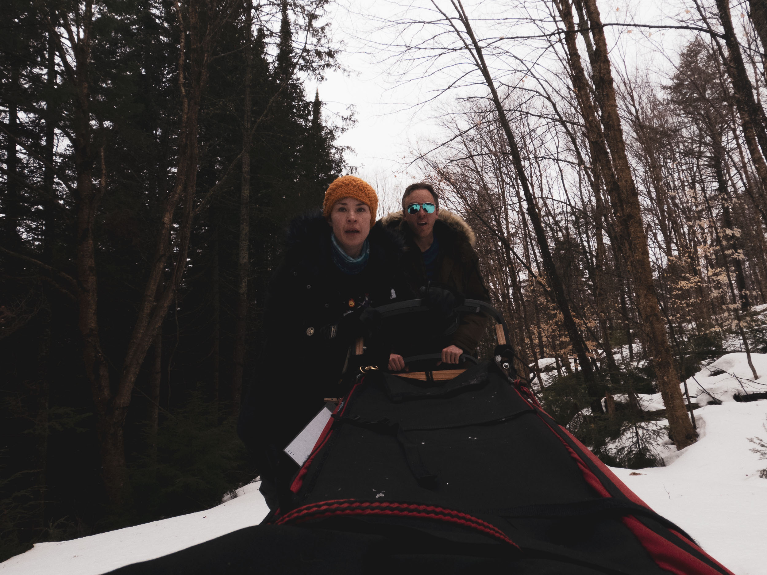 Robyn and I get the hang of balancing, leaning, and driving as we rocket down the path. The weather is a hint too warm; the light snowfall turns to a mix of slush and rain. Annoying but expected given the lateness of the season. There is still plenty of snow on the ground, which is all that matters.