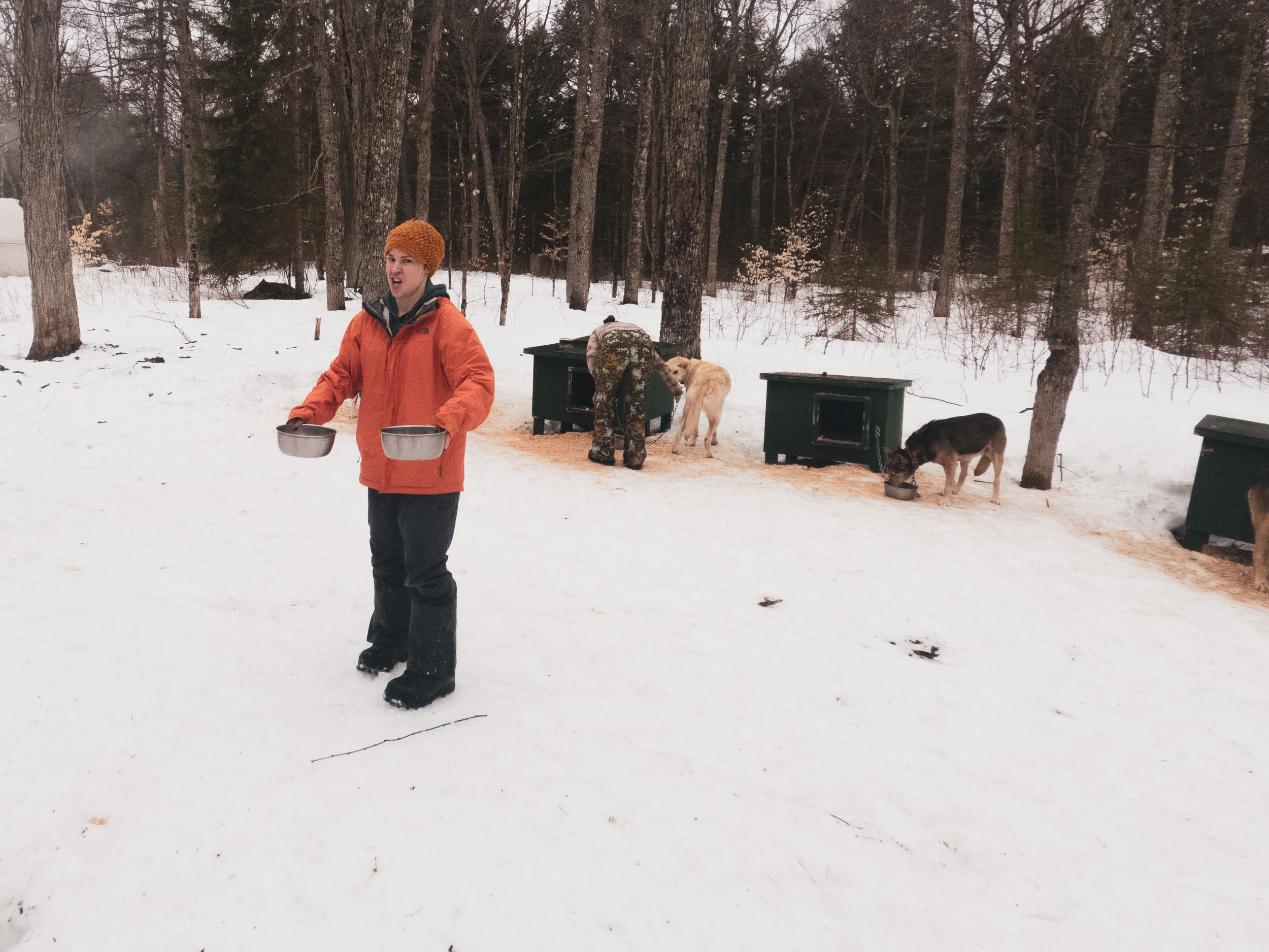 Despite the humidity, the rest of the ride to camp is incredible. Eventually, we pull up to 28 tiny houses that mark camp arrival. Upon arrival, the first step is to ensure that the dogs are cared for. We hastily unhook each dog, remove their harness, and walk them to their individual houses. Next come cuddles and massages for each, followed by water and dinner. Once complete, the pups mostly settle in for a well-deserved nap while we go unpack.