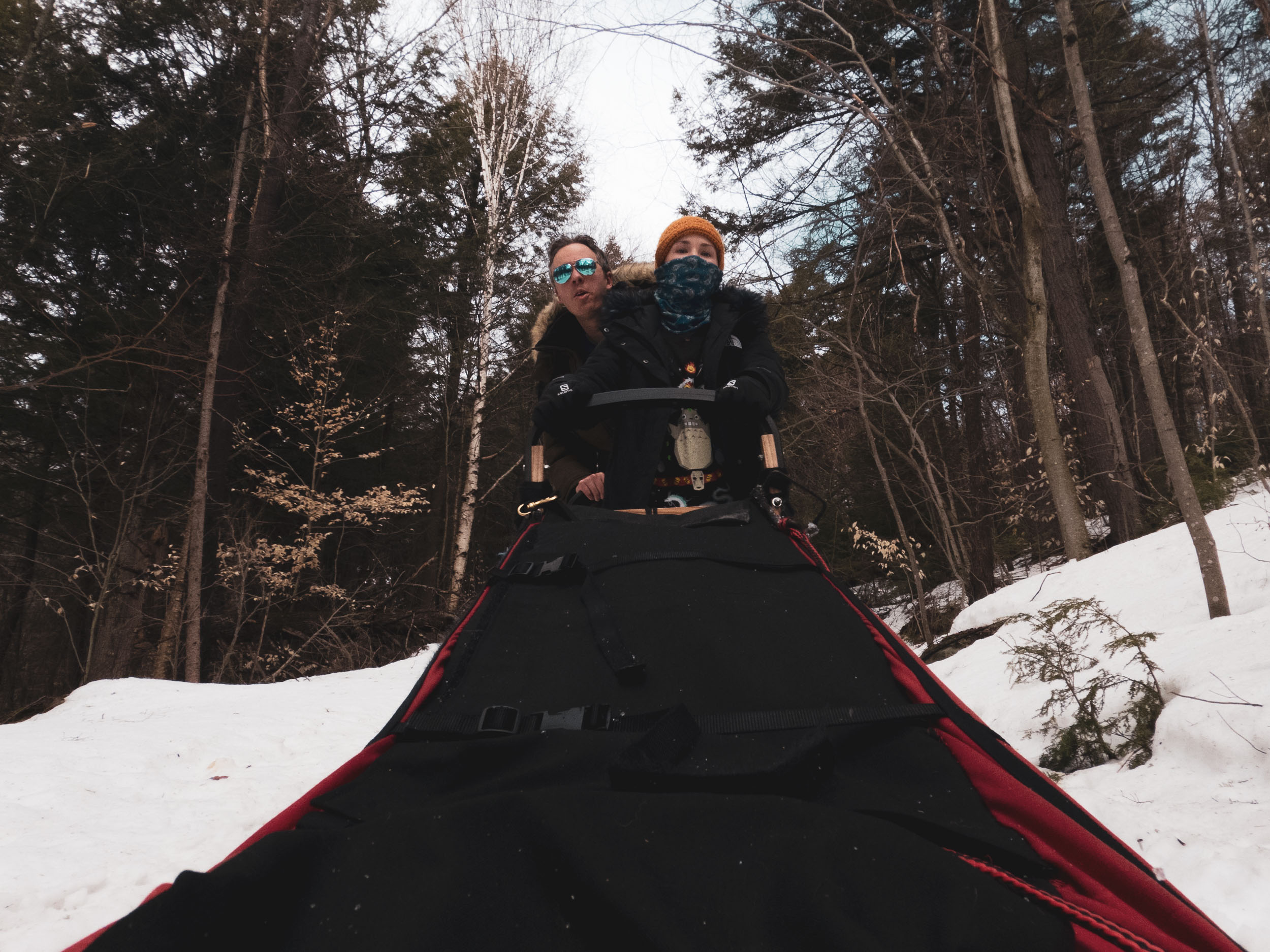 Meeting our team is the best part! We will be running with a pack of 7 delightful Alaskan Huskies. The two smallest, Ali and Mammo are upfront as our lead dogs. The magnitude of their kind, gentle nature is only eclipsed by their intelligence and focus. They know their job and are very good at it! Next in line are Pride and Laseine; Pride is exactly as his name suggests; he is regal and confident, always sitting with perfect posture. Laseine, in contrast, is a boisterous troublemaker. Leo and Burton are next up. Leo is a cuddle monster who happens to be a smidgen cross-eyed; Burton is the gramma of the bunch who will be retiring in two days! Finally, at the very end is Jaloux, who is not paired with anyone because he is quite the shit disturber. Nothing is easy with Jaloux, but his power is incredible, and ultimately he just loves to run and be loved.